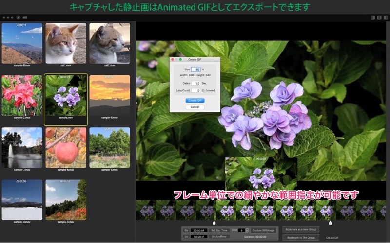 動画は膨大な写真の宝庫です。今まで気づかなかった「瞬間」を見つけよう! 主な機能: ・柔軟なスチル機能であなたの動画を豊富な写真集に。 ・「瞬間」を見逃さないための柔軟なシーク機能を搭載。フレーム単位のシーク、静止画の連続キャプチャ等が可能です。 ・アニメーションGIF作成機能 キャプチャした静止画はAnimated GIFとして書き出すことができます。 ・お気に入りのシーンをブックマーク 任意のシーンをブックマークしておけば、お気に入りのシーンを素早く再生できます。ブックマークはグループ分けが可能。コメントやスターもつけられます。 ・動画のジュークボックスとして 開いた動画はライブラリに自動登録されるので、ジュークボックスのように気軽に動画を切り替えて再生することができます。 ・HTMLエクスポート機能 対応動画形式:mpeg, mov, mp4,H.264ほかQuickTimeがサポートする形式
