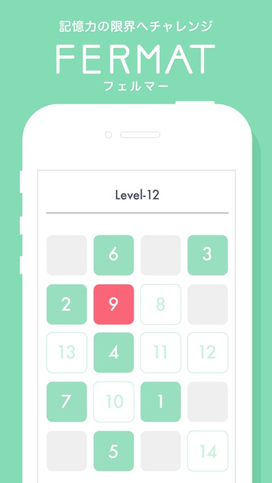 あなたも記憶力の限界にチャレンジしませんか?! 【どんなアプリ?】 「フェルマー」は数字の書かれたカードを記憶するアプリです。 【遊び方は簡単】 1. 数字を暗記します 2. 暗記したら「覚えた!」ボタンを押します 3. 暗記した通りに 1 から順にカードをタップします 正しい順番でタップできればクリア! あなたはどこまでクリアできる? 【記憶力アップにも?!】 毎日プレイすると記憶力アップ間違いなし! 通学、通勤時や時間の空いた時に反復トレーニングしよう! ワーキングメモリーのトレーニングとしても有効です。 是非一度プレイしてみてください。