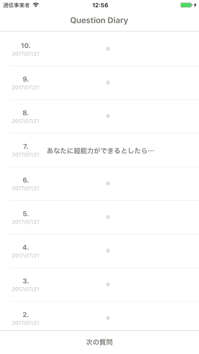 質問ダイアリーは初めてですか? 質問ダイアリーは毎日あなたに1つの質問をします。 あなたは今、幸せですか? 質問に答えてもいいし、 面倒なら、別に答えなくてもかまいません。 こうして毎日、新しい質問を受け取ることになります。 そして、 1年後のあなたに、もう一度同じ質問をします。 あなたは今、幸せですか? 1年前の自分の答えを振り返りつつ、 今もう一度、同じ質問をされたとき、 あなたはどう答えますか? 全く同じ答えになりそうですか? それとも、新しい答えでしょうか? あなたは今、幸せですか? Q&Aダイアリー、人生の質問、自分探しの質問などの質問ダイアリー、 手書きのダイアリーで簡単に探せるアプリケーションです。 全ての答えがサーバーに保存されるため、どこにいても簡単に見ることができ、どこでも使えます。 今日もあなたに質問します。 今日一日、いちばん多く頭をよぎったのはどんな考えですか? あなたの人生で守りたいものは、何ですか? 大人になるってどういうことですか? 今できる、一番おしゃれなことって何ですか? お金があればできる一番価値のあることは何ですか? 超能力を持てるとすれば、どういう能力がほしいですか? あなたの長所は何ですか? 最近チャレンジしてみたことにはどんなことがありますか? 人生の目的は何だと思いますか? よりよい人生とは何ですか? あなたの人生が少しでもあたたかくなりますよう。