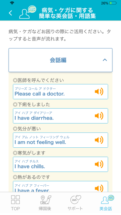 「サポートアプリ」は、ネット海外旅行保険「たびとも」のご契約者・被保険者様専用のアプリです。 海外へご出発前にスマートフォンへダウンロードして海外旅行へお持ちください。海外でご確認いただけるよう基本的にはオフラインでお使いいただけるアプリです。 【主な機能】 ①サポートセンターへの電話番号の確認・発信(発信はオフラインではご利用いただけません) ②サポートサービスの内容確認 ③困ったときの英会話(音声付き) ④保険金の必要書類の確認 ※通信を必要とするアプリ内のコンテンツを海外で利用する場合、通信費が高額になる場合がありますのでご注意ください。 ※このアプリは、スマートフォンを対象としているため、タブレット端末の動作については保証しておりません。
