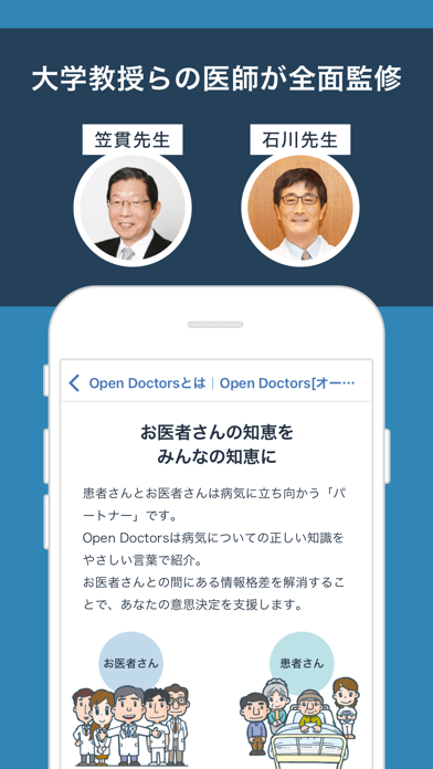 Open Doctors(オープンドクターズ)は、医師から提示された治療方針が自身に合っているかどうかを患者自身が考え、医師と相談のうえ意思決定することをサポートする医療情報サービスです。 ■こんなときにおすすめ ・ご家族やご本人が病気を診断されたとき ・病気に対してどのような症例・治療法があるのかを知りたいとき ・病気の難しい内容をわかりやすい言葉で正しく知りたいとき ■OpenDoctorss(オープンドクターズ)の特徴 ・大学教授らの医師が監修 前東京女子医科大学教授、笠貫宏氏、横浜市立大学教授の石川義弘氏ら医師による監修のもと、医師自身の経験を元にした病気に関する症例・治療データを主なコンテンツとして提供いたします。 ・『症例』に特化した情報 医師にとっては当たり前の治療方法が患者にとっては当たり前ではない、症例こそが患者の不安解決に繋がるのではないか、という観点から症例にフォーカスを当てました。ひとつの病気に対して年齢やステージの違う複数の症例を知ることができるため、例えば患者さんが病気の診断を受けた時、その症状や治療例などを具体的に知ることができます。 ■OpenDoctorss(オープンドクターズ)とは ~お医者さんの知恵をみんなの知恵に~ 患者さんとお医者さんは病気に立ち向かう「パートナー」です。 Open Doctorsは病気についての正しい知識をやさしい言葉で紹介。 お医者さんとの間にある情報格差を解消することで、あなたの意思決定を支援します。 ■現在掲載中の病名 胃がん,大腸がん,肝がん,肺がん,乳がん,肝炎,心筋梗塞,慢性腎不全,高血圧,脂質異常症,痛風,脳出血,脳梗塞,骨粗しょう症,糖尿病,慢性閉塞性肺障害,肺炎,ぜんそく,白血病 ■記事タイトル ・IIB期の小細胞がん。抗がん剤と放射線療法で治療(肺がん) ・「インスリン注射は不要」と自己判断、意識障害に(糖尿病) ・手足に紫色の斑点。歯ぐきからの出血も止まらない(白血病) など