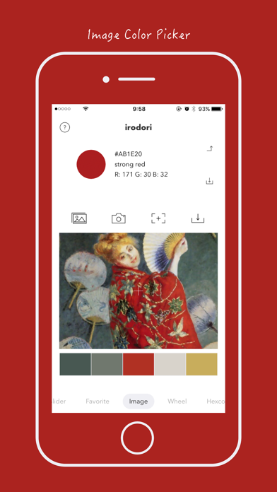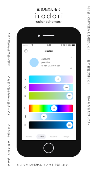 irodori -color schemes- は配色に役立つ様々なツールを詰め込んだ 多機能なカラーマネージャーアプリです。 こんなときにお使いいただけます。 ◆ RGB値・CMYK値などを確認したい。 ◆ 色の名前が知りたい。 ◆ 様々な配色を試したい。 ◆ 写真や絵の配色が知りたい。 ◆ イメージ通りの色を見つけたい。 ◆ グラデーションカラーを作りたい。 ◆ ちょっとした配色レイアウトを試したい。 ◆ お気に入りのカラーリストを作りたい。 配色に役立つ様々なツール ◆ Slide : RGB・HSB・CMYK スライダー。各スライダーが連動して色や数値が変化するので直感的に色を指定することができます。 ◆ Favorite : お気に入りのカラーリスト。プレビューを画像としてカメラロールに保存したり、簡単なレイアウトサンプルを試すことができます。 ◆ Palette : 約2000色の名前付きのカラーリスト。近似色を探したり、トーン・色相・名前から色を検索できます。 ◆ Image : 画像を読み込んで色を抽出することができます。 ◆ Hexcode : 16進数のキーボードです。webカラーコードなどで色を指定できます。 ◆ Gradation : 2色のグラデーションカラーを作成できます。 ◆ Wheel : 色相カラーピッカー。より直感的に色を指定できます。 ◆ Color Scheme : 透明度・彩度・明度・輝度・色環などの基本的な配色のほか、補色的配色・類似色的配色・トライアド配色・トーナル配色など、様々な配色を確認できます。 詳しい使い方はアプリ内のhelpボタンから、チュートリアルをご覧ください。