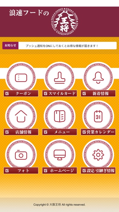 浪速フード株式会社が運営する、 【大阪王将】の公式アプリ ▶特徴 ・【大阪王将】からの最新情報をプッシュ通知で受け取れます。 ダウンロード後はプッシュ通知設定をONにしてくださいね。 ・アプリ会員限定のクーポンも配信予定です! お得に通いたい方にオススメです。 ・お会計500円につき1スタンプたまるスタンプカードもご用意! スタンプ12個で「餃子2人前」または「生ビール(中)」をプレゼント! ▶紹介 餃子をはじめとするリーズナブルな中華料理を提供している、大阪王将のフランチャイズ店舗を運営しています。 店舗でのお食事はもちろん、お持ちかえりメニューも充実しておりますので、ぜひ気軽にお越しください。 −−−−−−−−−−−−−−−−−−−−−−−− ご注意 −−−−−−−−−−−−−−−−−−−−−−−− ※アプリ利用は無料です。 ※最新版のアプリをご利用いただくためには、端末のソフトウェアアップデートでOSのバージョンを最新にする必要がございます。 ※一部ご利用頂けないOSがございますのであらかじめご了承ください。推奨バージョンはiOS10以上です。