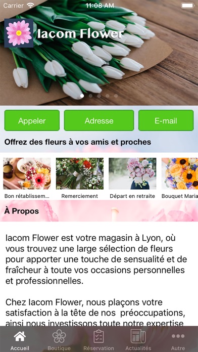 Bienvenue sur l’application Iacom Flower: Celui-ci vous permet de: - Consulter notre catalogue. - Consulter nos prestations. - Réserver l’article / la prestation que vous souhaitez. - Consulter les actualités. - Voir les avis des clients. - Ajouter votre avis. - Recevoir nos dernières offres par le système de notifications. - Être dirigé jusqu’à notre boutique (géolocalisation). - Nous contacter en un seul clic.