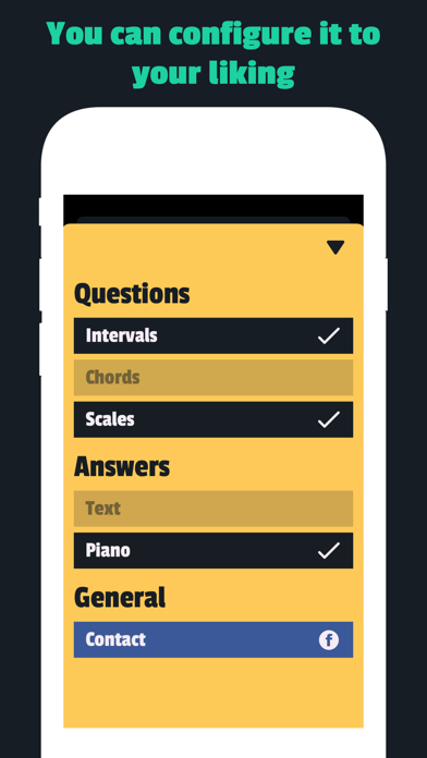 1. You can customize the quiz by selecting what kinds of sounds you want to practice, be it intervals, chords or scales. • Train your ability to identify musical intervals, chords and scales. • Randomly generated quiz which gets progressively more difficult as you progress. • Keep track of how many questions you got right and wrong per session. • Streak feature shows you how many you got right in a row. • Includes a library of intervals, chords and scales. • Include both text (e. g.