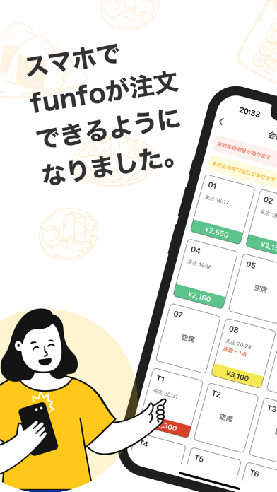 「funfo」はiPadとインターネット環境さえあればすぐにスタートできる無料POSレジ+モバイルオーダーアプリです。 お客様はご自身のスマホで注文を行うことで効率的な店舗経営を実現します。 見積もり&設置工事など煩雑な導入作業一切必要なく、アカウントを登録するだけですぐにセルフオーダー(店内モバイルオーダー)を実現します。 POSレジ、キャッシュレス決済、データ分析、ネットショップの立ち上げ(テイクアウト、デリバリー)など様々な場面にて活用することができます。 【主な機能】 ・POSレジ 「funfo」アプリPOSレジ機能は標準で搭載しております。先払い会計、後払い会計など様々な形式に対応しており、商品の割引と削除なども簡単に実現することができます。 *レシートプリンター、キャッシュドロワーとの連動にも対応します。 ・店内モバイルオーダー お客様は手持ちのスマホでテーブルにあるQRコードをスキャンし、自分のスマホから注文します。アプリのダウンロードや面倒な登録は一切必要ありませんので、そのままスムーズに注文を行えることができます。 ・店外モバイルオーダー 店舗アカウントからワンタップでFunPageという店舗アカウントと紐付いた店舗オリジナルのウェブページを生成することができます。お客様にリアルタイムのお店情報を届けると共に、テイクアウトやデリバリーの注文にも対応します。 ・キャッシュレス決済 店内・店外モバイルオーダーする際のオンライン決済は簡単に適用します。その上、Squareリーダーなどの決済端末と連携もできますので、店舗のキャッシュレス化をサポートします。 ・キッチンディスプレイ 注文内容はリアルタイムにiPad画面に表示されます。分かりやすい管理画面で注文内容や店内の空席状況を把握できます。 *キッチンプリンターの連動にも対応します。 ・メニュー管理 商品情報に関する設定は思うままに設定できます。さらに商品を長押しするだけで任意な位置やカテゴリーに移動可能なので、メニューの表示位置の変動などの操作は誰でも簡単に実現できます。その上、商品の在庫状態を切り替え、切り替え後の状態は瞬時にお客様側に表示されます。在庫状態は「販売中」「売り切れ」「本日売り切れ」の3種類に分かれています。 このすべての機能はfunfoアプリにより無料で実現します。 ※現時点、funfo for iPhoneはTableView及び注文関連機能がご利用いただけます。