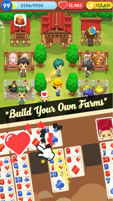 The game of Solitaire is now upgraded with a new mechanic: building farm. Unlock animals, buildings, and helpers who will help you collect products from the farm by earning money through playing Solitaire. It is a very relaxing game without all the mechanics of heavy IAP like other farm games. Features: _ Farm products are harvested within seconds! No need to wait for long hour harvest! _ Unlocked farmers will help you collect the products automatically, allowing an idle farming style. _ Gather hearts by chaining combos to unlock higher decks that yield more money each time you clear a solitaire stage. _ A variety of animals and crops waiting for you to unlock them. _ There will be a new world with new farm theme with different buildings, animals, and crops. Refreshing your gameplay experience. How To Play Farm: - A Cute Pixel-Art Ranch Manage a miniature stock farm on a single screen. No obnoxious dashing all over the place on errands. Run your very own ranch filled with a jumble of little characters bustling around. - Animal Areas Clean up an animal area and populate it with the animals of your choice. There are different facilities for different types—sheep, cows, pigs, and more. Design a ranch rich in diversity. - Wild Animals Once you get some life back into your ranch, wild animals such as wolves, foxes, and rabbits may show up. Increase your friendship level and get them all. - Overnight Guests Your ranch has overnight accomodations. Depending on what animals and facilities your ranch has, different guests will come to stay. Level up your guest rooms and attract them all. - Store You sell everything from livestock to animal products here. Customers will periodically stop by to make purchases. Level up your store to get more customers and earn coins faster. - Encylopedia Lists your farm animals, wild animals, guests, and fish. Collect all the characters! - Ranch Hands You can hire six ranch hands and assign them to the guest rooms, animal areas, and silo. As they level up, they learn to help with more jobs such as harvesting, cutting grass, and collecting room fees from the guests. Station them where you like and leave the work up to them. - Cute Helper You can unlock helpers and upgrade skill to help you collecting coins, experiences and products. How to play Solitaire: - You can move cards with single tap and drag them to their destination. - You can either play the easy Draw 1 games where most games are winnable, or if you feel up-to the challenge, try your luck with Draw 3 with Solitaire classic play mode. - You can use hints, undo and especially shuffle feature to support your experience when playing. - Depend on your scores (stars), you will get the gifts to increase numbers of the features. Play the Free Solitaire Card, bring back old memories of the period of time when solitaire reigned supreme. Train your brain and solve the Daily Challenge. Welcome to Solitaire Idle Farm, the most popular miniature style farming game on mobiles and tablets. Surrounded by animals and friends, let's harvest more and more!