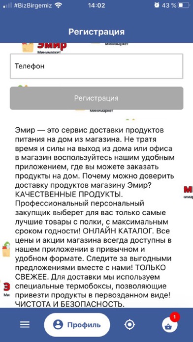 Эмир — это сервис доставки продуктов питания на дом из магазина. Не тратя время и силы на выход из дома или офиса в магазин воспользуйтесь нашим удобным приложением, где вы можете заказать продукты на дом. Почему можно доверить доставку продуктов магазину Эмир? КАЧЕСТВЕННЫЕ ПРОДУКТЫ. Профессиональный персональный закупщик выберет для вас только самые лучшие товары с полки, с максимальным сроком годности! ОНЛАЙН КАТАЛОГ. Все цены и акции магазина всегда доступны в нашем приложении в привычном и удобном формате. Следите за выгодными предложениями вместе с нами! ТОЛЬКО СВЕЖЕЕ. Для доставки мы используем специальные термобоксы, позволяющие привезти продукты в первозданном виде! ЧИСТОТА И БЕЗОПАСНОСТЬ. Персональные закупщики работают в одноразовых перчатках, продукты доставляются в герметичных боксах, пищевые и непищевые товары сортируются по разным пакетам. Все заказанные товары гарантированно приедут чистыми и неповрежденными! Эмир — это сервис доставки продуктов питания на дом из магазина. Не тратя время и силы на выход из дома или офиса в магазин воспользуйтесь нашим удобным приложением, где вы можете заказать продукты на дом. Почему можно доверить доставку продуктов магазину Эмир? КАЧЕСТВЕННЫЕ ПРОДУКТЫ. Профессиональный персональный закупщик выберет для вас только самые лучшие товары с полки, с максимальным сроком годности! ОНЛАЙН КАТАЛОГ. Все цены и акции магазина всегда доступны в нашем приложении в привычном и удобном формате. Следите за выгодными предложениями вместе с нами! ТОЛЬКО СВЕЖЕЕ. Для доставки мы используем специальные термобоксы, позволяющие привезти продукты в первозданном виде! ЧИСТОТА И БЕЗОПАСНОСТЬ. Персональные закупщики работают в одноразовых перчатках, продукты доставляются в герметичных боксах, пищевые и непищевые товары сортируются по разным пакетам. Все заказанные товары гарантированно приедут чистыми и неповрежденными!