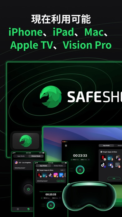 SafeShell VPN は、安全なグローバルネットワークを通じて、無制限かつ高速な VPN 接続を提供します。いつでもどこでも、速度制限のないプライベートでスムーズなインターネット体験をお楽しみください。 SafeShell は VPN に革新をもたらします! 独自の アプリモード を使えば、複数のアプリを同時に異なる地域に接続することが可能です。仕事中でも、ブラウジング中でも、国境を越えて連絡を取るときでも — SafeShell が安心をお届けします。iPhone、iPad、Mac、Apple TV、Apple Vision Pro に対応! SafeShell VPN の新機能である 字幕翻訳機能 は、30 以上の言語に対応しており、お気に入りのコンテンツを心に響く言語で楽しむことができます。元の字幕と翻訳された字幕が並んで表示されるので、快適に視聴できます。 今すぐ SafeShell を体験し、まったく新しいオンラインの自由を実感してください!iPhone、iPad、Mac、Apple TV、Apple Vision Pro に対応しています。 - アプリモード SafeShell 独自の特許技術により、複数のアプリを同時に異なる地域に接続でき、パーソナライズされた便利な体験を提供します。 - 隠れたIPでセキュリティを維持 ハッカーや監視から個人情報やオンラインアクティビティを保護し、隠れたIPアドレスと場所保護で匿名性を確保します。 - パブリックWiFi保護 パブリックWiFiネットワークを使用する際にデータのセキュリティを確保します。 - ログなしポリシー オンラインアクティビティや接続ログが最大のプライバシーのために保存されていないことを安心してください。 - アカウント不要 サードパーティのソーシャルメディア情報が収集されていないことを知って安心してください。 - 無料トライアル&サブスクリプション 無料トライアルと柔軟なサブスクリプションオプションで購入前にお試しください。 無料トライアルをお楽しみの場合、無料トライアルの最終日に請求されます。 サブスクリプションは、請求サイクルの終了時に自動的に更新され、有効期限日の少なくとも24時間前にキャンセルされない限り、キャンセルされます。 サブスクリプションを購入すると、未使用の無料トライアル期間が没収されます(該当する場合)。 サブスクリプションの利用規約はこちらからご覧いただけます:https://www.safeshellvpn.com/license/Subscription-Terms.html プライバシーポリシー:https://www.safeshellvpn.com/license/Privacy-Policy.html ユーザー登録:https://www.safeshellvpn.com/license/User-Agreement.html 詳細な情報については、公式ウェブサイトをご覧ください:https://www.safeshellvpn.com/ 利用規約(エンドユーザー使用許諾契約):https://www.apple.com/legal/internet-services/itunes/dev/stdeula/ お問い合わせやテクニカルサポートについては、当社の専門チームまでお問い合わせください: メール:support@safeshellvpn.com Telegram:@safeshellvpn