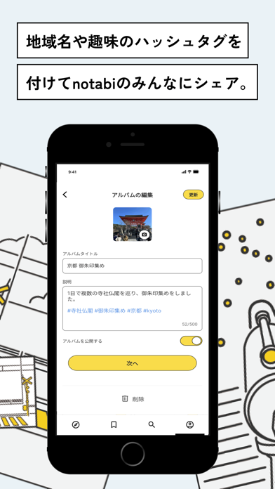 あなたのスマホに入っている写真から、過去の旅を見つけ出し、自動的に旅のアルバムを生成します。 アルバムで過去の旅を見返したり、誰かのアルバムを見て次の旅の計画を立てたり。 notabiは、あなたのたびがもっと好きになるアプリです。 【notabiの魅力】 あなたの大切な思い出を整理して、notabiのみんなに届けよう。 * notabiがあなたの代わりに旅のアルバムを作成。懐かしい旅のアルバム作成もどんどん捗る。大切な思い出がいつでも見返せる状態に。 * 写真と感想・コメントに加え、写真の位置情報をもとに旅のルートもまるごと記録。寄り道やちょっとしたハプニングなど 素敵な旅を思い出すきっかけに。 * あなたの旅に地域名やハッシュタグ(#ぬい撮り #日本酒 #お城巡り #子連れ旅行 #国内旅行 #海外旅行など)をつけて公開すると、あなたの旅が他の誰かの新しい出会いや体験につながるかも! 大好きな趣味や気になる地域から次の旅先を見つけて、みんなが登録したアルバムをもとに旅行を計画しよう。 * 地域名やハッシュタグ(#推し活 #韓国旅行 #バイク #ペット旅行 #ラーメン #温泉旅行 など)で検索すれば、みんなが記録した旅のアルバムが見つかります。 * みんなのアルバムを開くと、旅の最中に撮影された「写真」と「スポット」がマップで閲覧できるので、旅行先や現在地周辺の観光スポットや写真撮影スポットを発見できます。 * 旅のルートが地図上に表示されるから、旅行のスケジュールや行程も組みやすい!そのまま、旅のしおりとして使うこともできます。 * アルバムに書かれた感想・コメント・口コミから、みんなのおすすめポイントも知れる! * 気に入った旅のアルバムは保存・ブックマークができ、ブックマークリストからいつでも見返すことができます。 【こんな人にオススメ】 - 旅の記録を残したい人 - 同じ趣味やこだわりを持つ人と繋がりたい人 - 新しい旅に挑戦してみたい人 のたびびとになって、もっと自由に、旅を楽しもう。