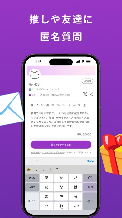 mondの使い方: - mondリンクをSNSにシェアする - たくさんのメッセージや応援を受け取る - 画像や動画、テキストで返信をつくる - SNSに回答をシェアする 安全性に配慮するため、mondではAIを活用した自動モデレーションシステムを利用し、不適切なコンテンツを含むメッセージをフィルタリングしています 利用規約:https://mond.how/ja/terms-of-service プライバシーポリシー:https://mond.how/ja/privacy/registration-form