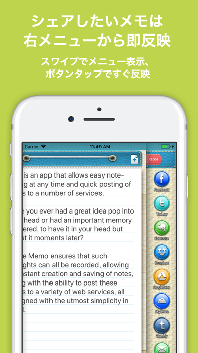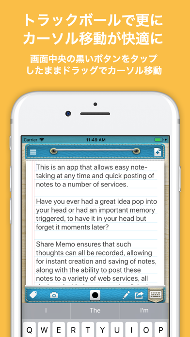 思いついた時にメモをさっと書いていろいろなサービスに即投稿できるアプリです。 ふと思いついたアイディア、ちょっとしたきっかけで思い出したことなど、せっかく頭に思い浮かんでも、次の瞬間忘れてしまうことってありませんか? Share Memoはそんなことを漏れなく記録できるよう、即メモが取れて勝手に保存、さらに書いたメモをSNSなど、様々なウェブサービスへ投稿するまでを徹底的にシンプルにすることを目的に開発しました。 iPhoneのテキスト入力の煩わしさを改善するため、フリックによるカーソル移動、テキスト選択、メニューの移動に加え画面中央にトラックボールを搭載することでカーソル移動をスムーズに行えるようになっています。 ※トラックボールはトラックボールをタップして、指を画面につけたままカーソルを移動させたい方向に指を動かすことで、カーソルが移動させることができます。 トラックボールをダブルダップして移動させると文字選択になります。 ※メモ編集中に右、または左へフリック操作をするとフリックした方向へカーソルを移動できます。 その他の機能 - タグを使ってメモを効率的に管理 - 1つのメモに複数の画像ファイルを保存 - チェックボックス、日付の入力補助 - フォントサイズの変更 - メモの検索 - メモの作成日、更新日、テキストでメモ一覧を並べ替え 現在対応しているサービス - Facebook - Twitter - Evernote - Dropbox - Google Drive - OneDrive - Tumblr 使用できるサービスは今後も追加していく予定です。