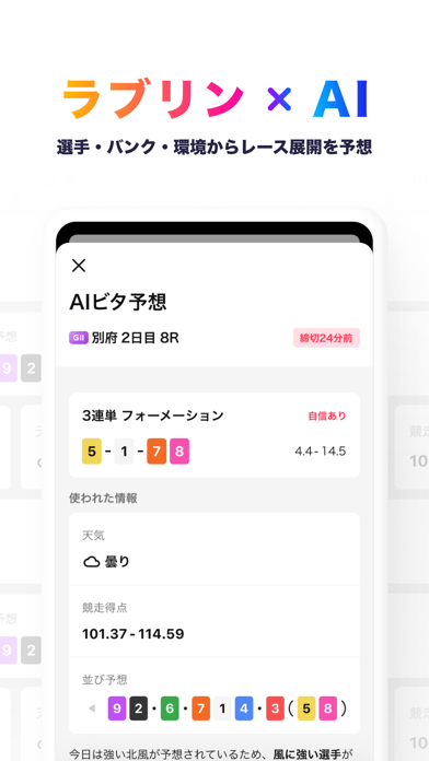 【ラブリンの特徴機能】 <まずは無料で投票体験> バーチャル投票で練習スタート。自分のお金を使わずに気軽に競輪を楽しめるので、ルールを覚えたい初心者の方や、新しい予想戦略を試したい時にも最適です。 <AIビタ予想で勝率アップ> 選手の実力やバンクの特徴、その日の環境からレース展開をAIが瞬時に予想!あなたにぴったりの組み合わせを提案してくれます。注目すべき指標のポイントも解説してくれるので、使えば使うほどあなたの予想スキルも磨かれていきます。 <おまかせ投票で車券を購入> 「どのレースが良いかわからない」という時でも、ラブリンが厳選したおすすめレースと買い目を毎日お届けするので、くじを引くような感覚で手軽に車券を購入できます。お気に入りのコースを見つけて毎日投票していれば、思いがけない的中や回収のチャンスが舞い込んでくるかもしれません。 <ステップサポートで自分好みの予想を> 気になる指標や、応援している「推し選手」の組み合わせを選ぶだけ!あなたのこだわりを反映したおすすめの買い目を、ラブリンがスマートにピックアップしてくれます。 <LIVEボードで観戦の熱量を手元に> レースの状況をリアルタイムで実際に競輪場でレースを見ているかのような体験を味わえます。コメントやシェア機能を使えば、全国のファンと一緒に白熱したレース展開を語り合い、盛り上がることができます。 <チェックインでポイント獲得> 全国の競輪場を訪れた際にチェックインするだけで、ポイントを獲得できます!さらに、現地での観戦がもっと楽しくなる期間限定クーポンを獲得できるチャンスも。実際の競輪場へ足を運び、時速70kmを超える生の迫力と熱狂を肌で感じながら、エキサイティングな観戦体験を楽しんでください。 【ラブリンの登録登録は簡単4ステップ!】 1. メールアドレスの登録 2. 本人情報(氏名・生年月日)の登録 3. 本人確認書類の提出 4. 暗証番号の登録 【チャージ方法が、豊富!操作もカンタン!】 クレジットカードやPayPay・au Payのスマホ決済からコンビニ決済の現金決済まで、様々な手段でチャージをすることが可能です。 アソビュー!会員と連携すればアソビュー!ポイントも利用できます。 <チャージ方法> ・クレジットカード - VISA - Master Card - JCB - DinersClub ・スマホ決済 - PayPay - auPay - ApplePay ・コンビニ決済 - ファミリーマート - ローソン - ミニストップ - セイコーマート ・連携ポイント - アソビュー!ポイント 【競輪とは】 競輪は、戦後日本で生まれた公営競技です。現在では「KEIRIN」としてオリンピック種目にも採用されるほど、世界的に認められた究極の自転車競技でもあります。 ・知略と肉体のぶつかり合い: 最大時速70kmに達する爆発的なスピードはもちろん、選手同士の絆や戦略が交錯する「ライン」と呼ばれるチーム戦の駆け引きが、競輪最大の魅力です。 ・365日、全国で開催: 北は北海道から南は九州まで、全国各地の競輪場で毎日開催。夜間に開催される「ミッドナイト競輪」なら、お仕事帰りや寝る前のリラックスタイムにも手軽に楽しめます。 【グレードレース(G1)(重賞レース)】 ・全日本選抜競輪 ・オールガールズクラシック ・日本選手権競輪(ダービー) ・高松宮記念杯競輪 ・女子オールスター競輪 ・オールスター競輪 ・共同通信社杯 ・寛仁親王牌・世界選手権記念トーナメント ・競輪祭 ・KEIRINグランプリ 【注意事項】 ※20歳未満のお客様はご登録いただけません。 ※中央競馬・地方競馬・競艇・ボートレースなどへの投票はできません。 ※中央競馬・地方競馬・競艇・ボートレースなどへの投票は、別サービスにてお楽しみください。 【車券の購入にのめり込む不安のある方へ】 これは、現金賭博アプリです。 責任を持ってギャンブルをおこない、予算の範囲内でのみ賭けるようにしてください。 車券の購入にのめり込む不安のある方、お悩みの方は下記までご相談ください。 ■ 公営競技ギャンブル依存症カウンセリングセンター ・電話カウンセリング:0120-321-153 ※フリーダイヤル ※ご利用になる場合は上記電話番号にてご予約をお願いします。 予約受付時間 平日9:00~20:00(除く 土曜日・日曜日・祝日・年末年始) ・メールカウンセリング:https://tms-soudan.com/gamble/ ※受付から概ね3営業日以内に返信 ■ 一般財団法人ギャンブル依存症予防回復支援センター ・サポートコール:0120-683-705 ・HP:http://www.gaprsc.or.jp -------------------- 【プライバシーポリシー】 https://www.loverin.com/privacypolicy 【利用規約】 https://www.loverin.com/termsofuse 【お問い合わせ】 サービスの不具合・ご意見・ご要望につきましては、お問い合わせフォームよりご連絡ください。 https://www.loverin.com/contact