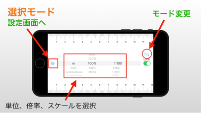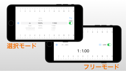 スケール定規は、いろいろな縮尺の目盛りを表示するシンプルなアプリです。 ※注意 ・表示精度は、保証できません。 ・校正、PPI値は機種が変わった際、リセットされます。 ・PPI値は機種未確定の場合のみ設定してください。 ・PPI値を設定した場合、その後校正を行ってください。 ■選択モード UNLOCK中に、単位、倍率、縮尺を選択すると目盛りが表示されます。 ■フリーモード UNLOCK中に、画面をドラッグすると、1:1〜1:100の範囲で縮尺を設定できます。 また縮尺表示部を長押しすると、キーボードが表示され、縮尺を入力することができます。 目盛りの表示は、スイッチでロックすることができます。 アンロック中は広告が表示されます。 課金後、広告は表示されなくなります。 スケール定規の仕様 ・単位 メートル、インチ ・倍率 50% , 70.7% , 100% , 141% , 200% ・縮尺 m系 1:100 , 1:150 , 1:200 , 1:250 , 1:300 , 1:400 , 1:500 , 1:600 inch系 1:1 , 1:1.5 , 1:2 , 1:2.5 , 1:3 , 1:4 , 1:5 , 1:6 inch(アーキテクチュラルスケール)系 1:1 , 1:2 , 1:4 , 1:8 , 1:12 , 1:16 , 1:24 , 1:32 , 1:48 , 1:64 1:96 , 1:128 , 1:192 , 1:384 inch(エンジニアリングスケール)系 1:120 , 1:240 , 1:360 , 1:480 , 1:600 , 1:720 1:800 , 1:960 , 1:1080 ■設定 ・校正 ・PPI(pixels per inch) 設定 ・アプリ内課金(広告非表示) ・アプリ内課金復元 ■校正 定規の長さの調整を行います。 調整は正しい定規を使用してください。 「校正」ボタン:調整した状態を記録し、校正結果を定規の表示に反映します。 「リセット」ボタン:調整状態を規定値に戻します。記録はされません。 「初期化」ボタン:調整状態を規定値に戻し、 定規の表示に反映します。 ※注意:校正値は機種が変わった際、リセットされます。 ■PPI(pixels per inch) 設定 機種が未確定の場合、機種のPPI値を確認の上、PPI値を設定してください。 ※機種未確定の場合のみ、設定してください。 「OK」ボタン:入力したPPI値を記録し、定規の表示に反映します。 「初期化」ボタン:PPI値を規定値に戻し、定規の表示に反映します。 ※注意:PPI値は機種が変わった際、リセットされます。