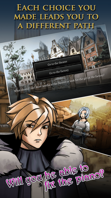 Different from any Visual Novel EVER before! Decide the fate of Overture and the magical revolution. ------ Important Information ------ This is the lite version of the game, which allows you to play about a quarter of the game for free. The full version is available here: https://itunes.apple.com/us/app/an-octave-higher/id975806907 ------ Story ------ Explore Overture with Elise, Franz and Frederic as they set on their own paths, each joined by one thing: a broken piano. This visual novel allows you to explore the world where each person is gifted in different types of magic that has been revolutionized into creating magic machinery. The industry is evolving and the world of this visual novel finds itself on the forefront of technology; at the cost of their own working class. But in a world where magic defines your class, there is unrest in the background and rumors of a revolution are stirring. Amongst all this magic, there is something that they can’t do: use healing magic on inanimate objects. As Franz does his final year project at school on just that – healing inanimate objects – most people find it a fruitless study. Due to fate, he is able to get financial backing from Frederic’s Dad because of Elise and her desire to fix a broken piano with her healing magic. Little do the characters know that on the edges of their lives a revolution is brewing that can shake their whole existence and the world of Overture. Join the adventure in this visual novel, unlike any other visual novel you’ve played before, as you question right and wrong, good and bad and everything in between. Does Overture really need a revolution? ------ Features ------ A quarter of the full game 2 different paths 3 different points of view A large range of characters Can save at any point in the game Gallery ------ Characters ------ Elise [The factory worker who tried to heal a broken piano] Life isn’t easy when you are a Proletarian, Elise is told that her class doesn’t have the luxury to choose a happy ending. But none the less she stays positive, for all she wants to do is play the piano. Her life is drastically changed through her chance meeting with Franz. Franz [The final year student who is researching the effect of healing magic on inanimate objects] At the top of a prestigious school of magical science, Franz’s professor has high hopes for him. Franz is entrusted with a project that could be the key to revolutionising the magical industry, but Franz isn’t all that enthusiastic. But when he meets Elise, things slowly start to change Frederic [The aristocrat who will do anything to get Elise’s attention] Frederic is well known as a Sorcerer, a magical sport fighter, as well as being Lord Godwin’s son. He’s arrogant and has no regard for those below him, but there is an unexpected side to him that even himself may not know. He falls in love with Elise at first sight, and will do anything to support her. If only his pride didn’t get in the way. ------ How to Play ------ Playing is super easy, just follow the story and select your choices as you go along. There are 2 paths to explore in the lite version, and 6 different endings in the full version.