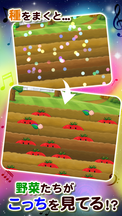のんび〜り遊べるホッコリ野菜育成ゲーム。 かわいい野菜のキャラクター達が登場します。 野菜たちが奏でる音楽に癒やされましょう(^^) 野菜を収穫して音楽を完成させましょう。 ◇◆◇ゲームの流れ◇◆◇ ①種をまきます。 ②野菜に成長するまで待ちます。 ③野菜が顔を出してきたら収穫します。 ④収穫した野菜がビニールハウスで音楽を奏でます。