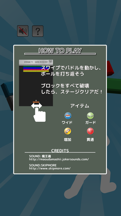 シンプルなブロック崩しです。 単純ですが、面数が多く後半の難易度が高いです。 お助けアイテムもあります。 ・アイテム紹介 ガード:左右にボール落下を防ぐガードが追加されます。 ロングバー:バーの長さが長くなります。 増殖:ボールが増えます 貫通:ボールがブロックを貫通します。ただし非破壊ブロックは貫通できません。